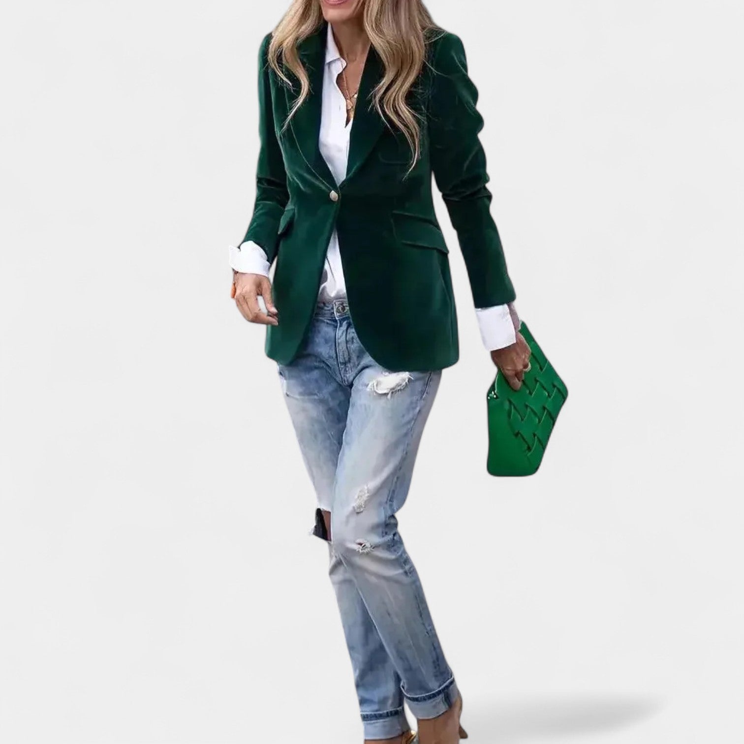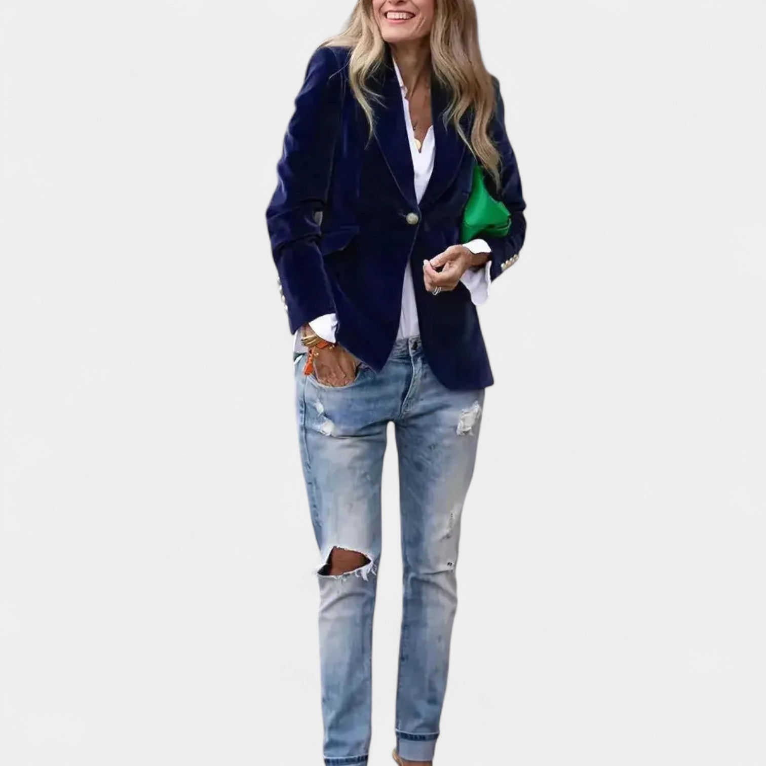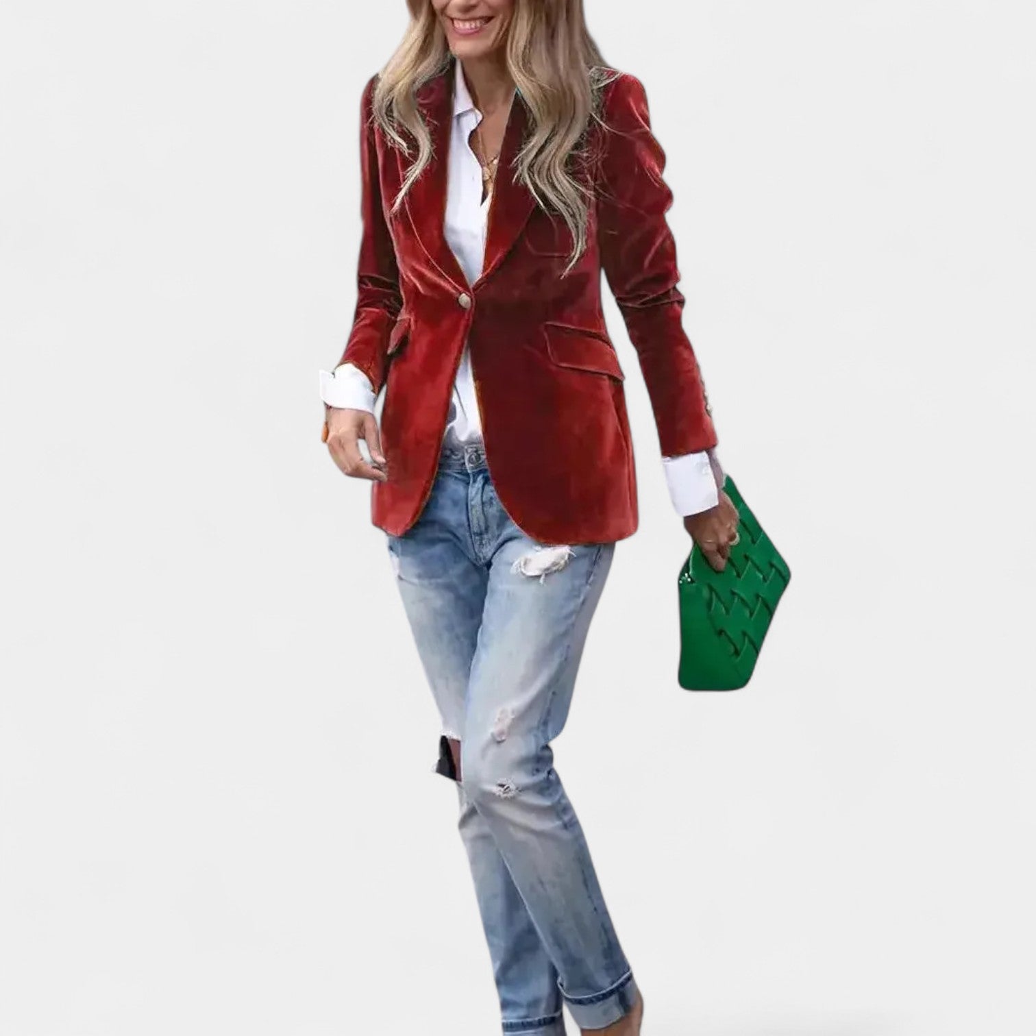 O blazer Andrea com uma suave superfície de veludo é a peça perfeita para mulheres que desejam parecer elegantes e confiantes em qualquer situação. Graças ao seu corte preciso com fecho de um único botão, lapelas afiadas e ombros ligeiramente estruturados, cria uma silhueta lisonjeira que combina tanto com jeans como com conjuntos mais elegantes. Os botões dourados nas mangas acrescentam um detalhe sofisticado ao todo.