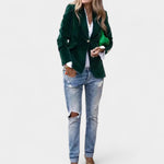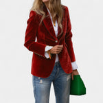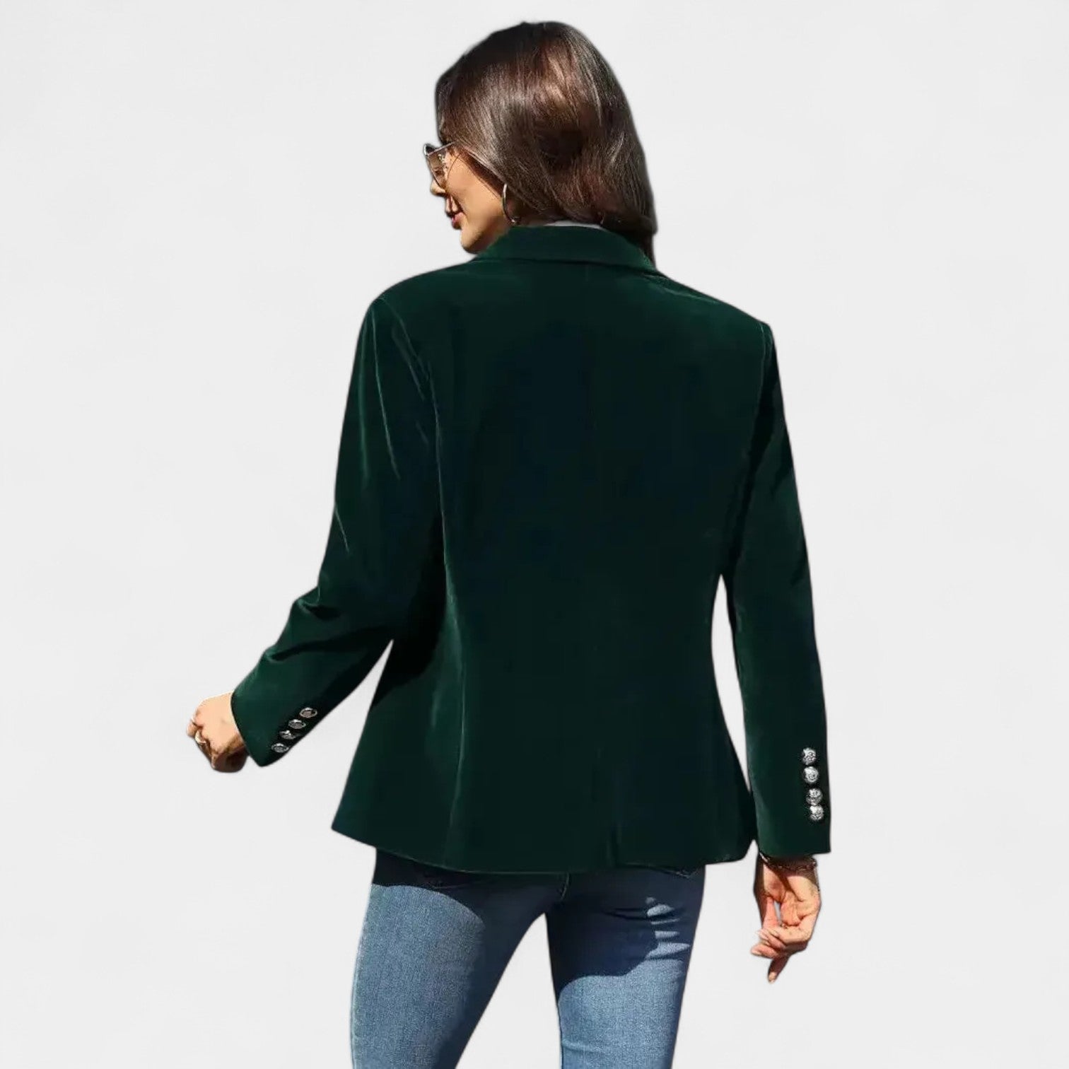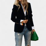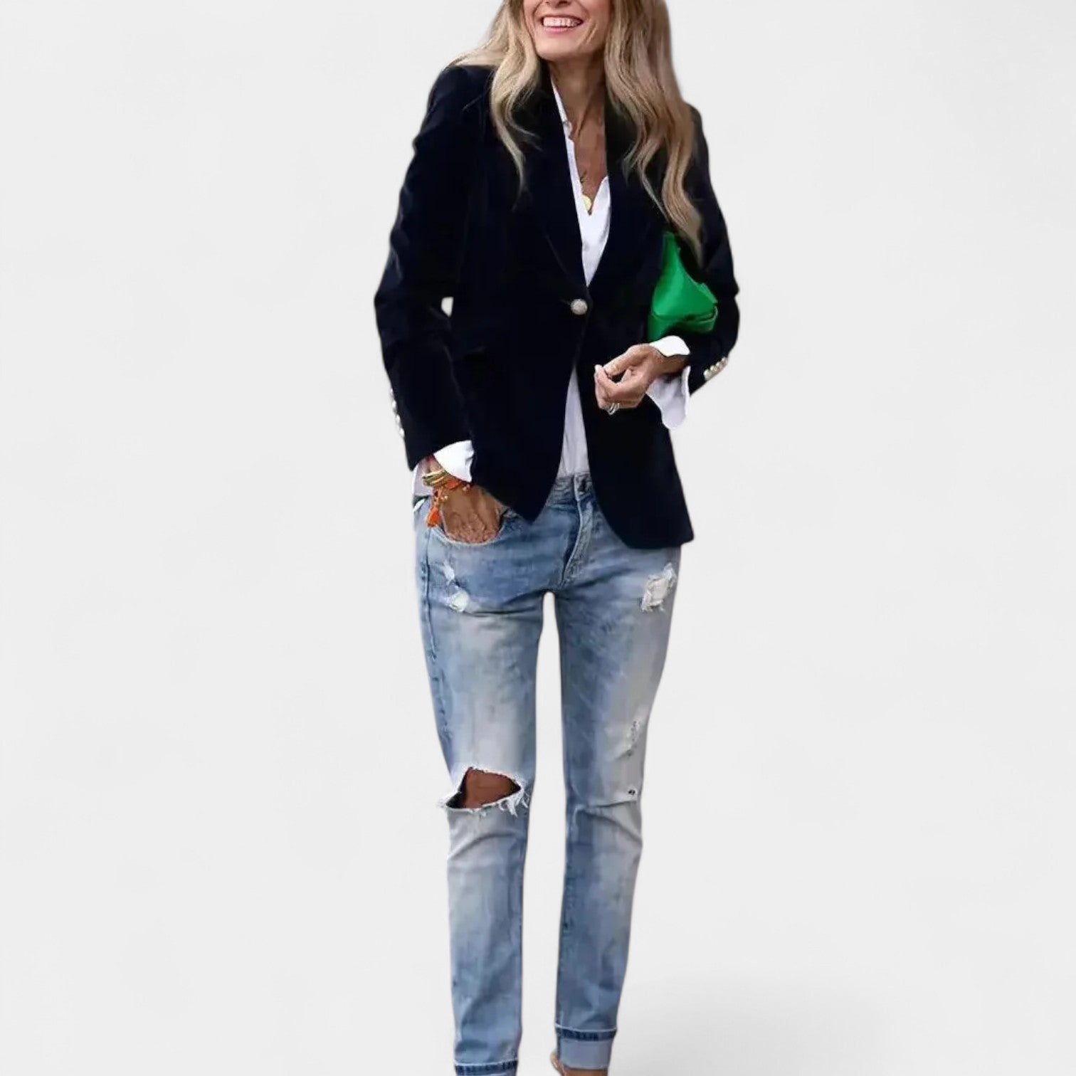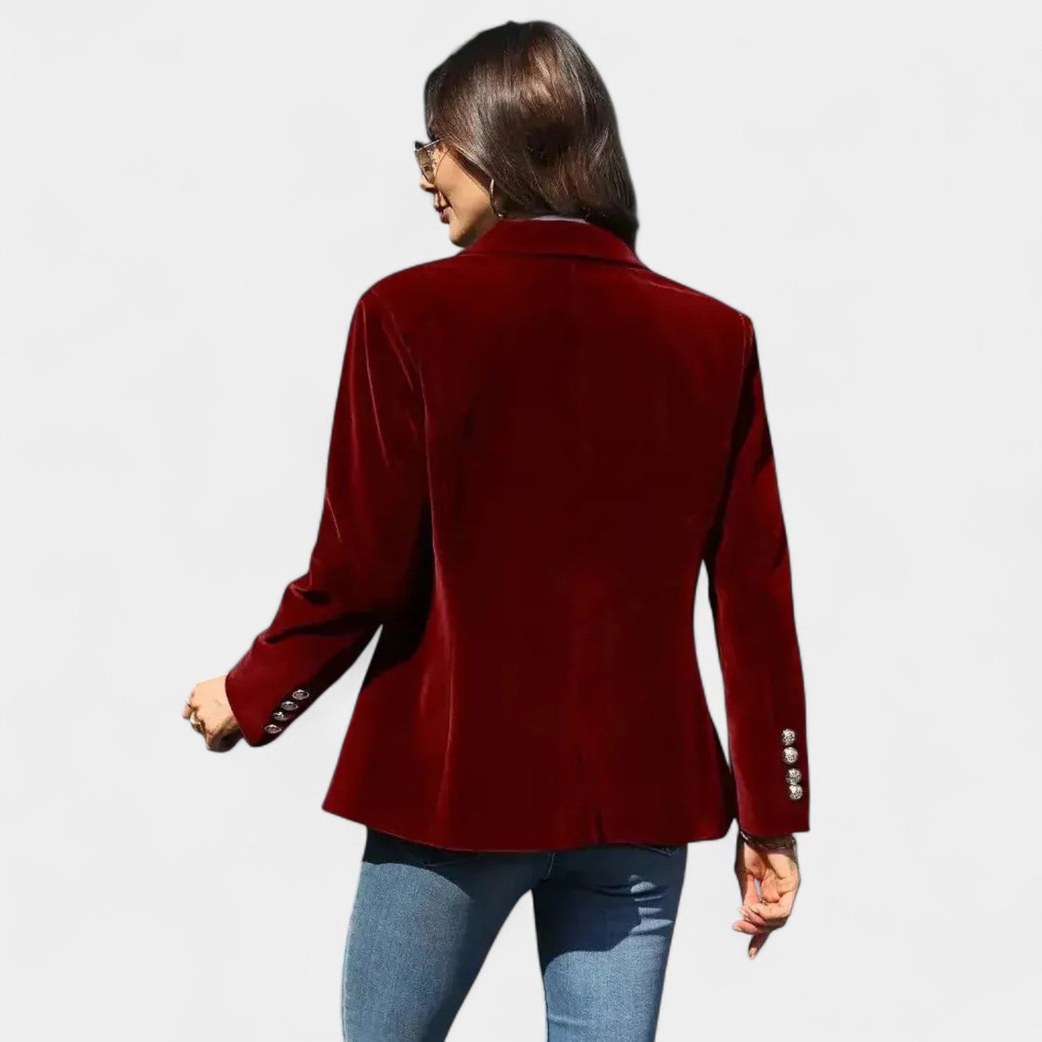 O blazer Andrea com uma suave superfície de veludo é a peça perfeita para mulheres que desejam parecer elegantes e confiantes em qualquer situação. Graças ao seu corte preciso com fecho de um único botão, lapelas afiadas e ombros ligeiramente estruturados, cria uma silhueta lisonjeira que combina tanto com jeans como com conjuntos mais elegantes. Os botões dourados nas mangas acrescentam um detalhe sofisticado ao todo.